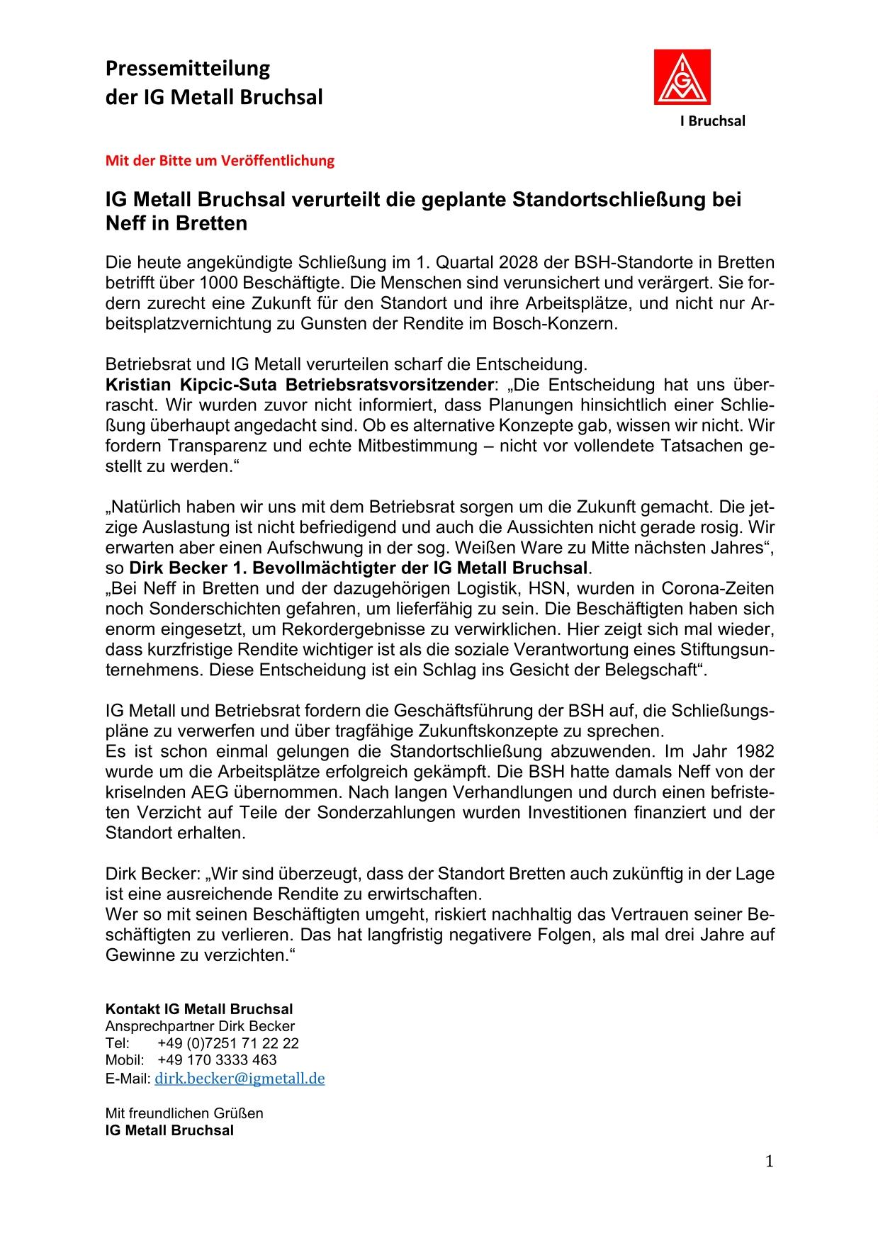Die heute angekündigte Schließung im 1. Quartal 2028 der BSH-Standorte in Bretten