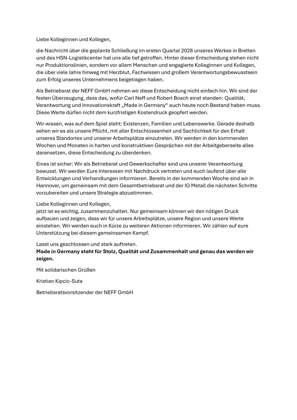 Als Betriebsrat der NEFF GmbH nehmen wir diese Entscheidung nicht einfach hin. Wir sind der festen Überzeugung, dass das, wofür Carl Neff und Robert Bosch einst standen: Qualität, Verantwortung und Innovationskraft „Made in Germany“ auch heute noch Bestand haben muss. Diese Werte dürfen nicht dem kurzfristigen Kostendruck geopfert werden.