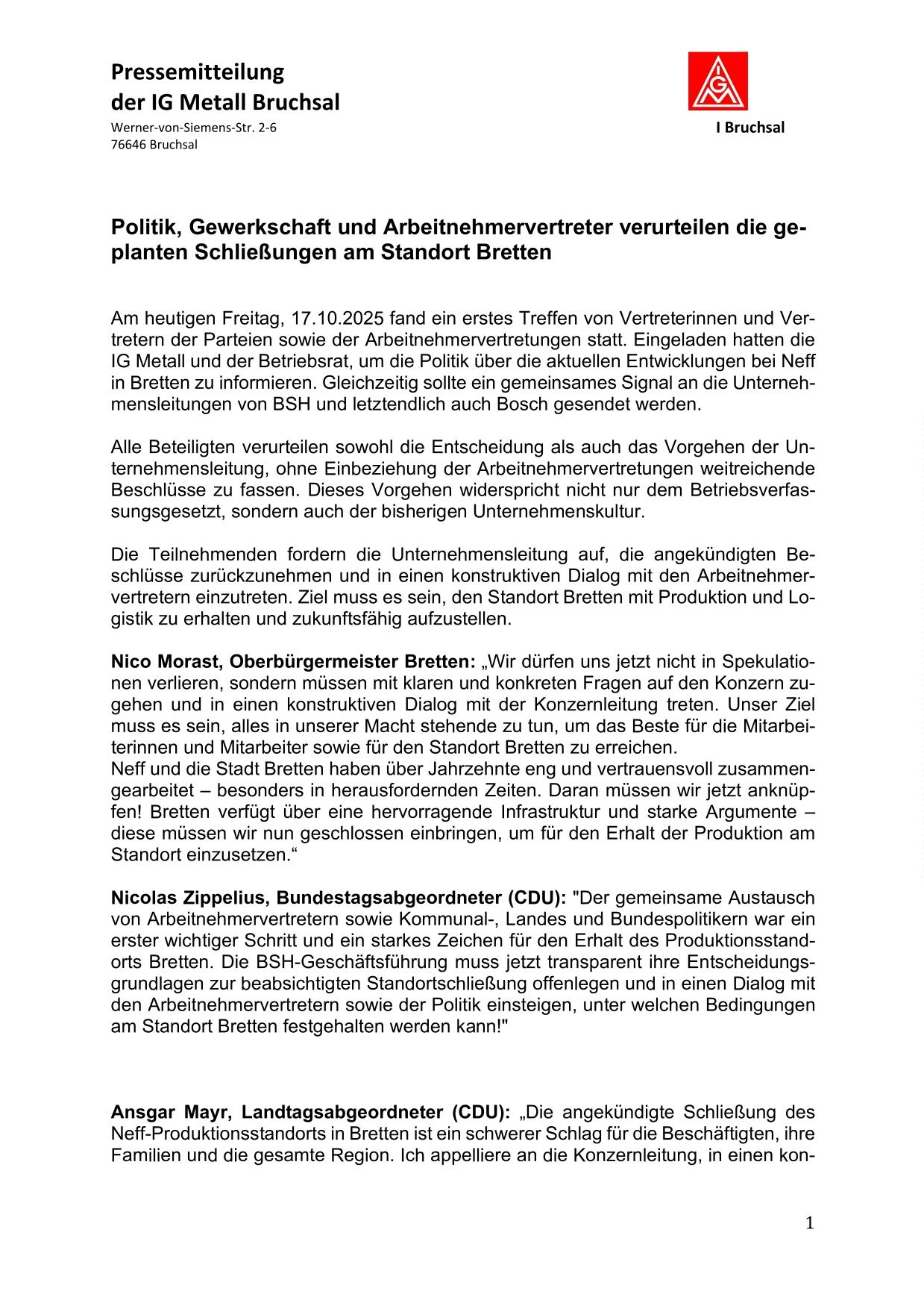 Am heutigen Freitag, 17.10.2025 fand ein erstes Treffen von Vertreterinnen und Vertretern der Parteien sowie der Arbeitnehmervertretungen statt. Eingeladen hatten die IG Metall und der Betriebsrat, um die Politik über die aktuellen Entwicklungen bei Neff in Bretten zu informieren. Gleichzeitig sollte ein gemeinsames Signal an die Unternehmensleitungen von BSH und letztendlich auch Bosch gesendet werden.