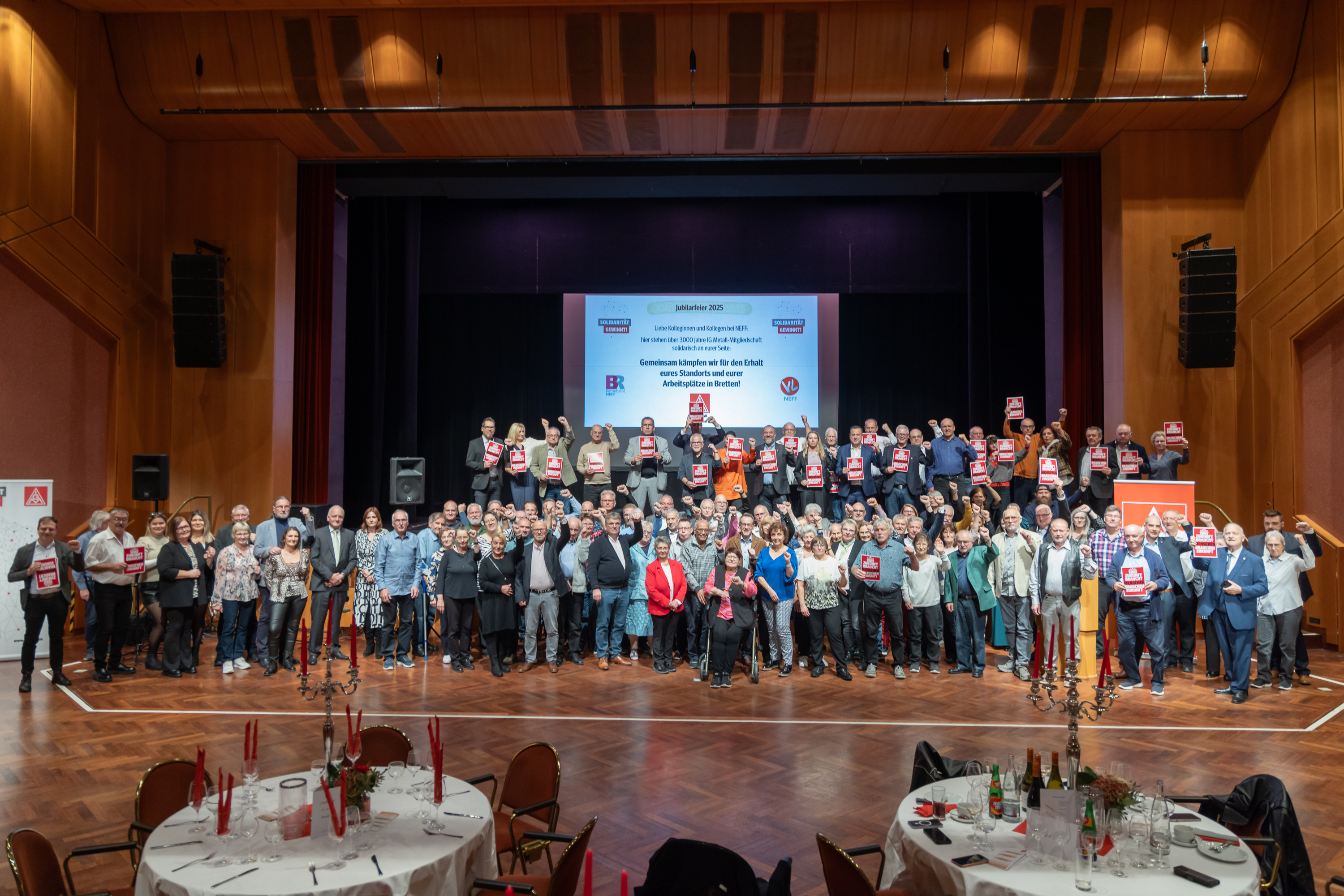 Aufgrund der aktuellen Situation bei NEFF und HSN in Bretten solidarisierte sich die gesamte Jubilarfeier mit Kolleginnen und Kollegen bei NEFF und HSN. In einer Foto-Aktion wurde die uneingeschränkte Solidarität im Kampf um den Standort in Bretten und die Arbeitsplätze signalisiert.