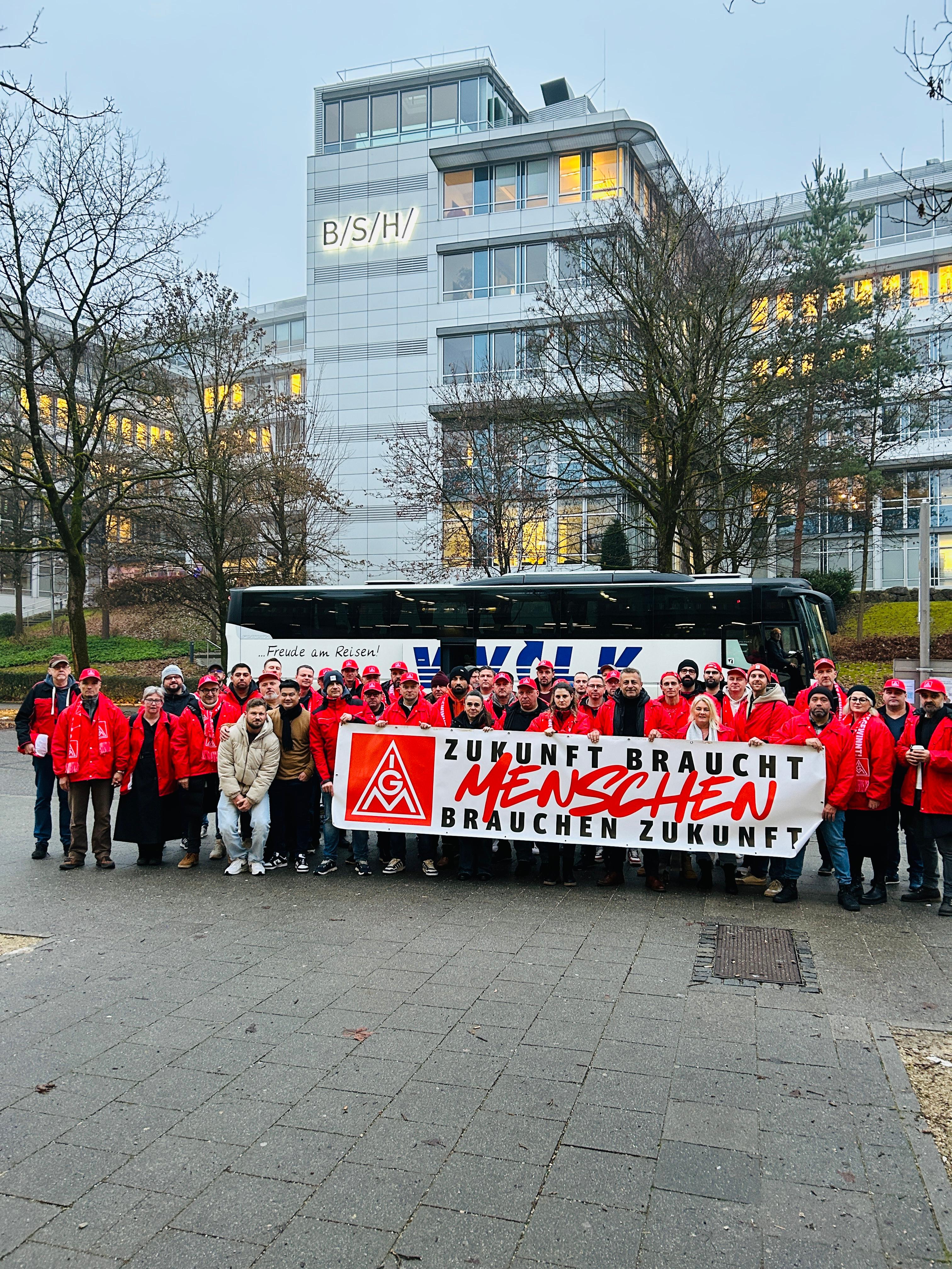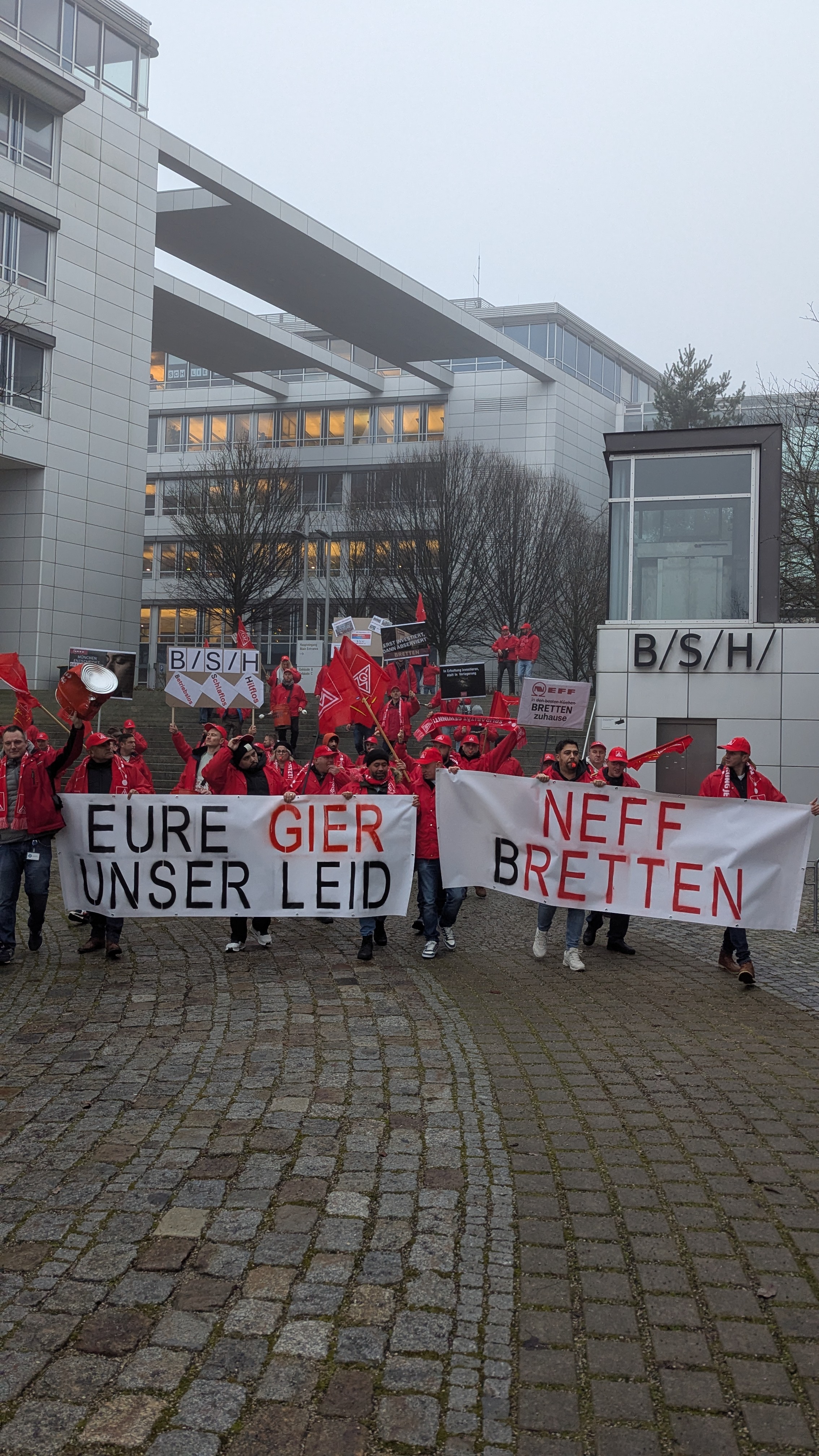 Um ihren Betriebsratsvorsitzenden lautstark bei seiner Rede in der Betriebsversammlung der BSH-Zentrale in München zu unterstützen, haben sich am 11. Dezember 2025 ca. 60 Neffler mit dem Bus in die bayrische Landeshauptstadt begeben.