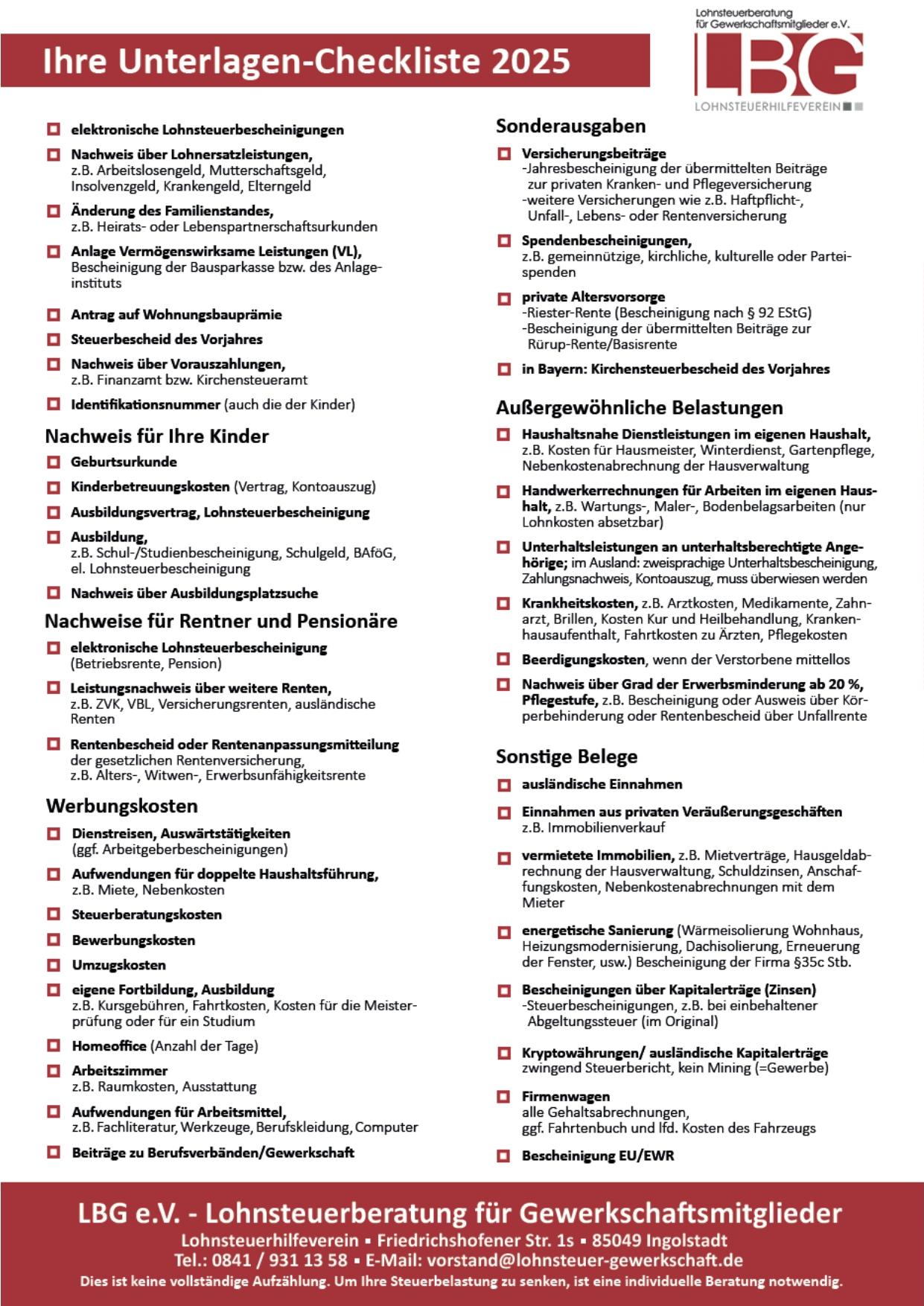 Der Lohnsteuerhilfeverein LBG berät unsere Mitglieder nach Terminvereinbarung in unseren Räumlichkeiten und erstellt die Steuererklärung zu fairen Preisen.