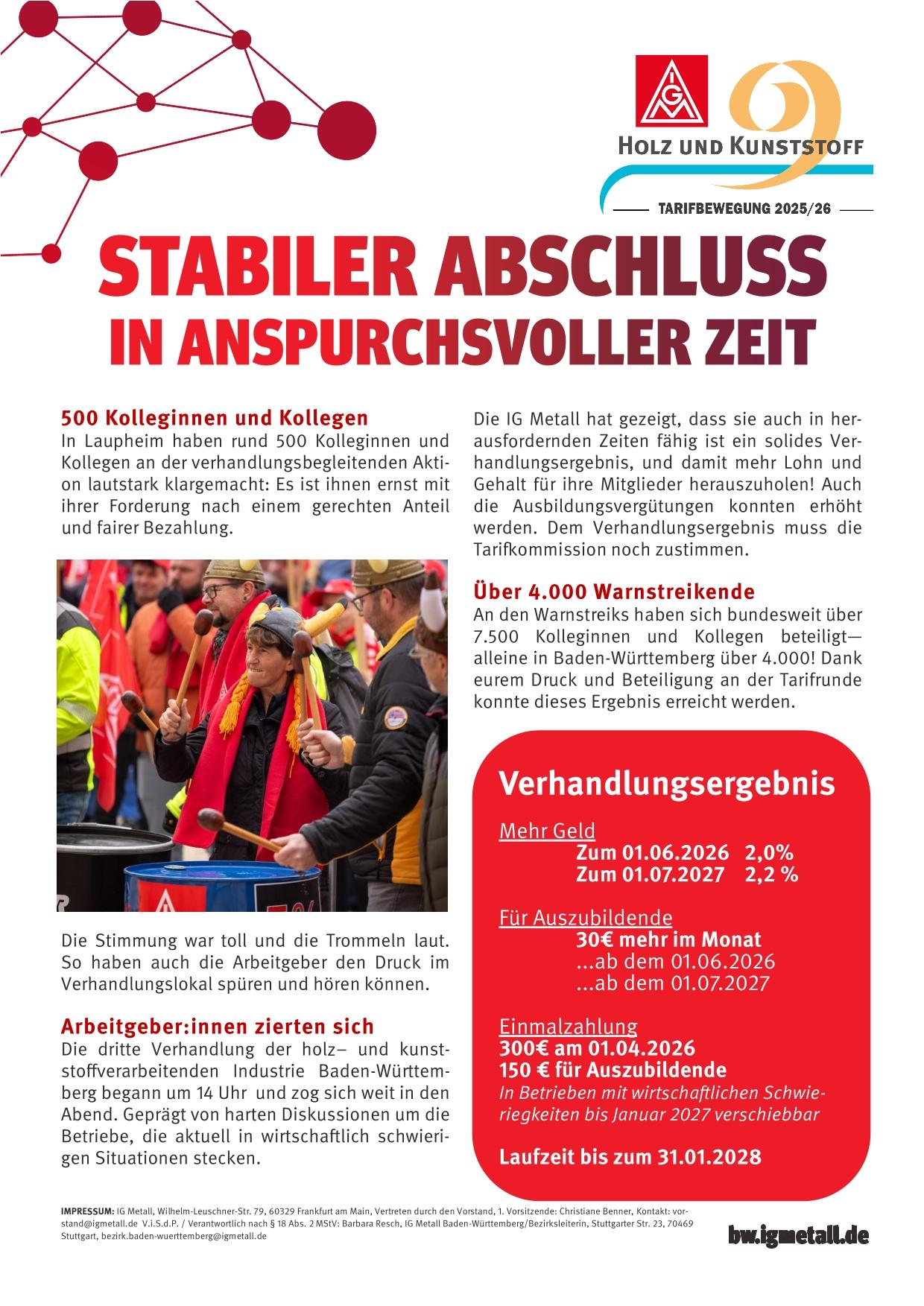Laupheim. In der dritten Verhandlungsrunde haben sich die IG Metall und die Arbeitgeber der Holz- und kunststoffverarbeitenden Industrie in Baden-Württemberg am Abend des 19. Januar auf ein Verhandlungsergebnis verständigt: