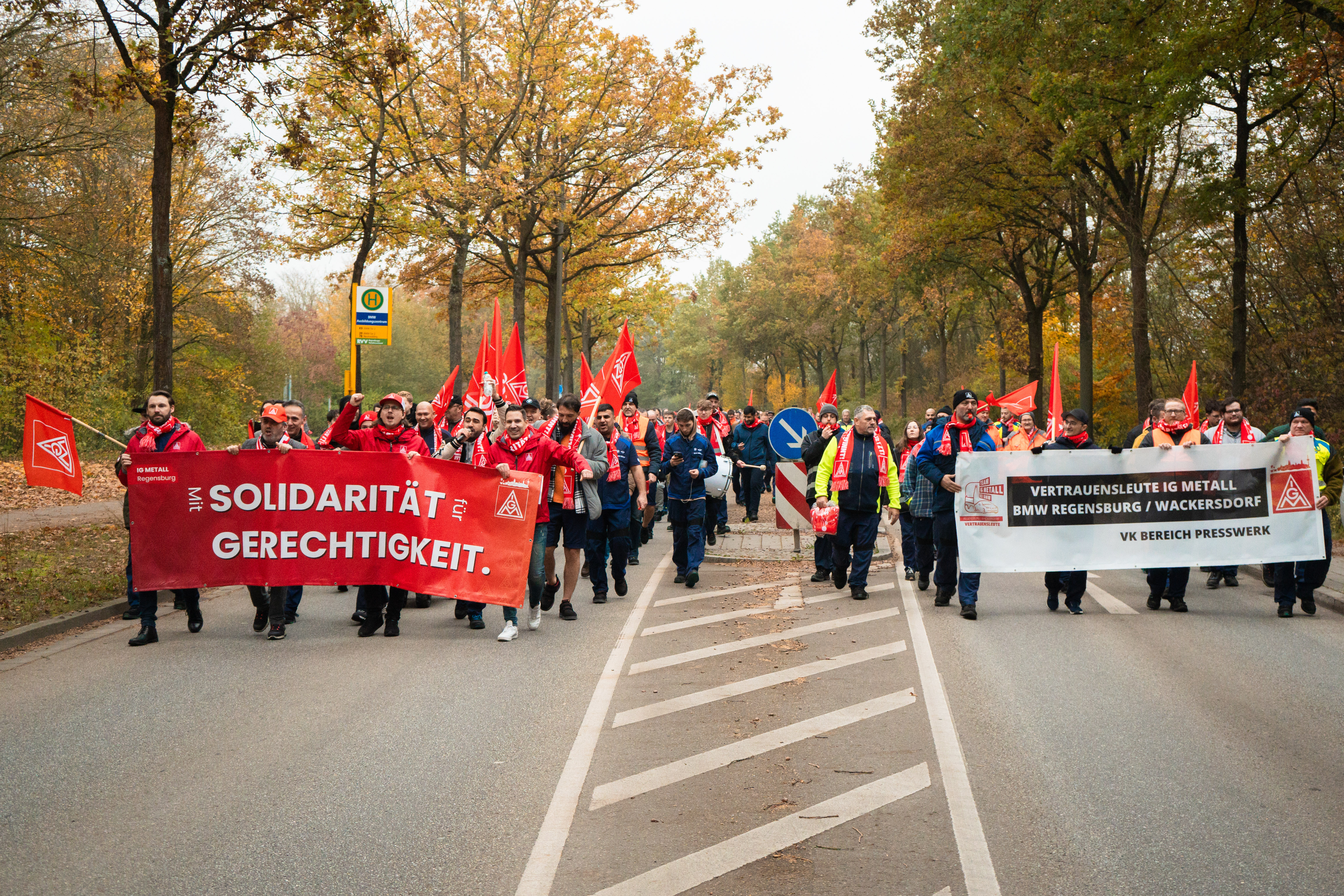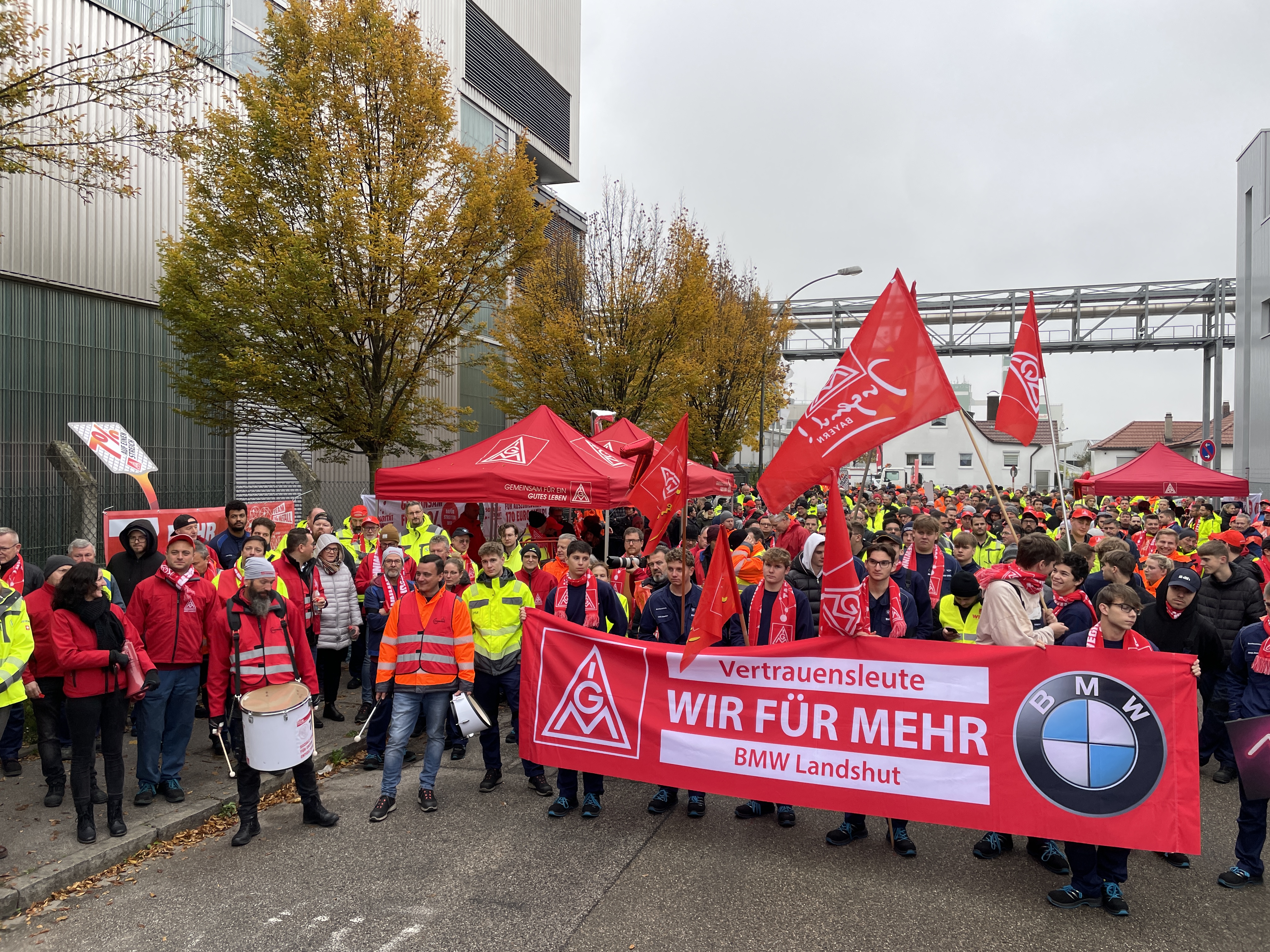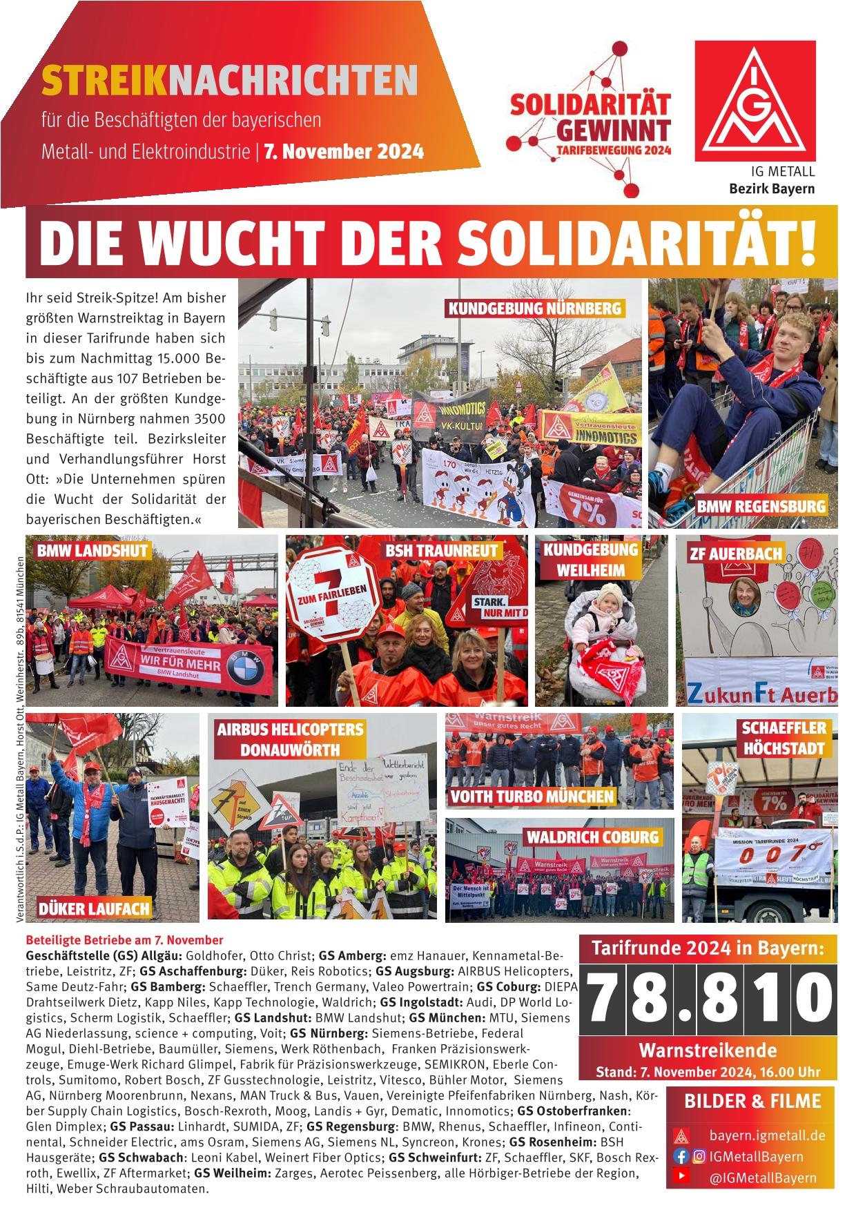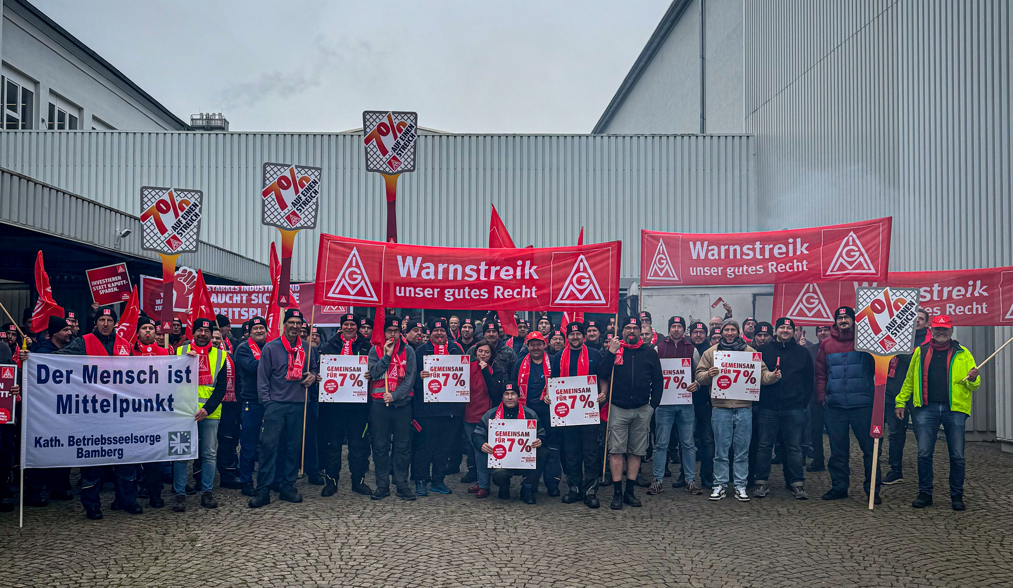 Am bisher größten Warnstreiktag in Bayern mit 107 beteiligten Betrieben haben heute bis zum Nachmittag rund 15.000 Beschäftigte der Metall- und Elektroindustrie vorübergehend die Arbeit niedergelegt. Allein in Nürnberg sind 3500 Beschäftigte aus 35 Betrieben in drei Demozügen zu einer Kundgebung in der Südstadt gepilgert. Vor dem Regensburger BMW-Werk versammelten sich 3000 Warnstreikende aus elf Regensburger Betrieben zu einer Großkundgebung. Die Bänder im BMW-Werk standen für zweieinhalb Stunden still. Ebenfalls für zweieinhalb Stunden legten die BMW-Kollegen der Frühschicht in Landshut die Arbeit nieder und demonstrierten für sieben Prozent mehr Geld.