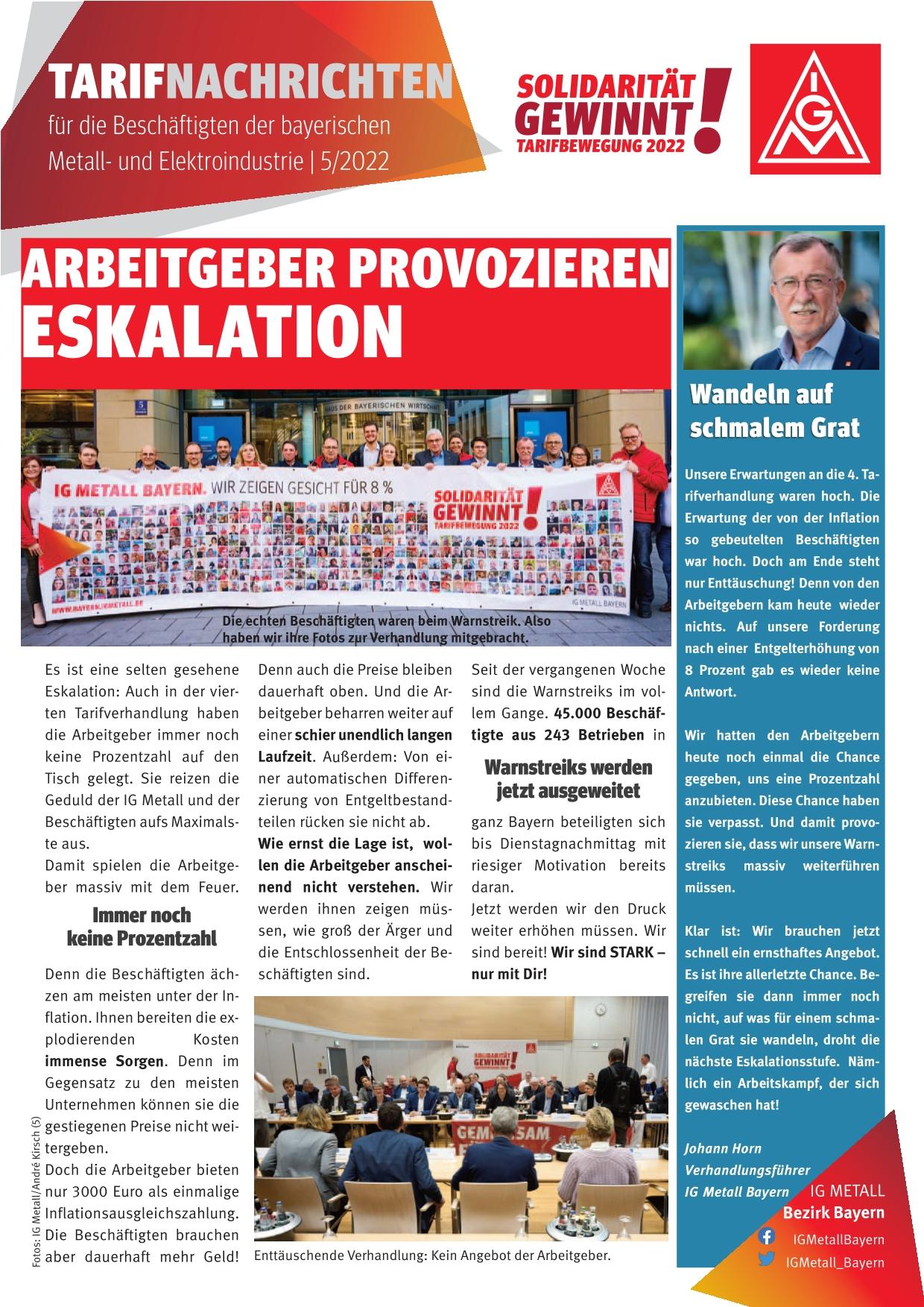 Ergebnislos ist die vierte Tarifverhandlung für die bayerische Metall- und Elektroindustrie am 8. November 2022 in München beendet worden. Die Arbeitgeber haben ihr viel zu schwaches Angebot lediglich wiederholt und immer noch keine Prozentzahl für eine Entgelterhöhung angeboten. Eine Ausweitung unserer Warnstreiks und eine weitere Verschärfung unseres Arbeitskampfes stehen jetzt unmittelbar bevor. Die IG Metall fordert für die 855.000 Beschäftigten in der bayerischen Metall- und Elektroindustrie 8 Prozent mehr Geld für eine Laufzeit von zwölf Monaten.