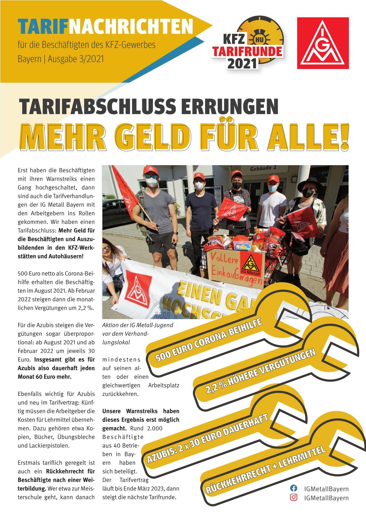 Der IG Metall Bayern und den bayerischen Arbeitgebern ist ein Durchbruch in der bundesweiten Tarifrunde für das Kfz-Handwerk gelungen. Gestern Abend einigten sich die Tarifparteien bei der zweiten Verhandlung in Augsburg auf einen Abschluss für die Beschäftigten in den bayerischen Autohäusern und Werkstätten. Demnach erhalten die Beschäftigten im August 2021 500 Euro netto als Coronabeihilfe und ab Februar 2022 2,2 Prozent mehr Entgelt. Die Vergütung der Auszubildenden steigt ab August 2021 und ab Februar 2022 jeweils um 30 Euro. Der Tarifvertrag läuft 22 Monate bis Ende März 2023.