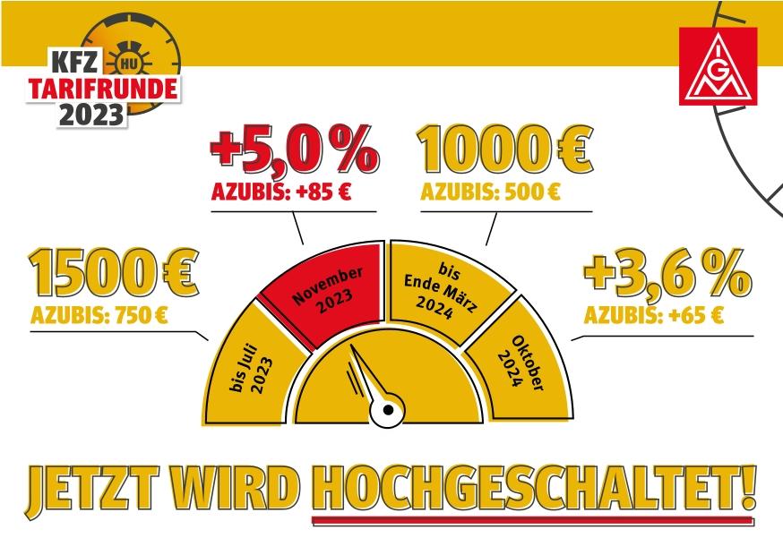 Und damit ist noch nicht Schluss: Bis Ende März 2024 erhalten die Kolleginnen und Kollegen weitere 1000 Euro steuerfrei. Für Azubis sind es übrigens 500 Euro. Und dann, bevor es in die nächste Tarifrunde 2025 geht, wird im Oktober 2024 nochmals einen Gang hochgeschaltet: Im Herbst des nächsten Jahres gibt es dann nochmals ein kräftiges Entgeltplus in die Tabelle von 3,6 Prozent. All das, war nur möglich, da viele tausend Beschäftigte im Kfz-Handwerk in voller Mannschaftsstärke auf die Straße gegangen sind und mit Warnstreiks die Arbeitgeber zum Einlenken gebracht haben. Wieder mal zeigt sich: Gute Tarifabschlüsse fallen nicht vom Himmel. Im Kfz-Handwerk gibt es sie nur mit der IG Metall. Deswegen: Wer noch kein Mitglied ist, sollte schnellstmöglich beitreten!